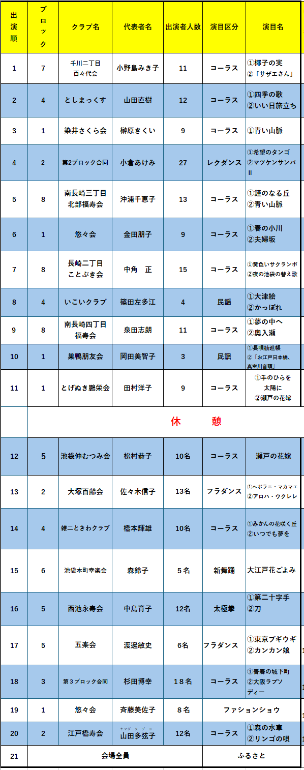 「芸能まつり」のプログラムの原案が出来ました。 まだ、若干の修正があるかもしれませんが、出演者の「タイムスケジュール」にご利用ください イベント 全国・小地域福祉活動サミット開催! 関連記事 全国・小地域福祉活動サミット開催! チョコレートの効果を知るセミナー! 「いきいき豊島110号」発行! 「チョコ・プレゼント付きセミナー」へお招き! 「定例理事会」を開きました 「新春のつどい」和やかに開催! 「第9回ボッチャ選抜大会」を開催! 「いきいき豊島寄席」今春も開催!
